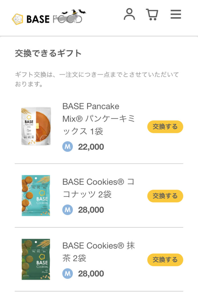 このベースフード独自のマイルが貯まると、ベースフードの商品やノベルティ等のギフトと交換できるから、ベースフードの公式サイトでのお買い物が、さらに楽しくなります!